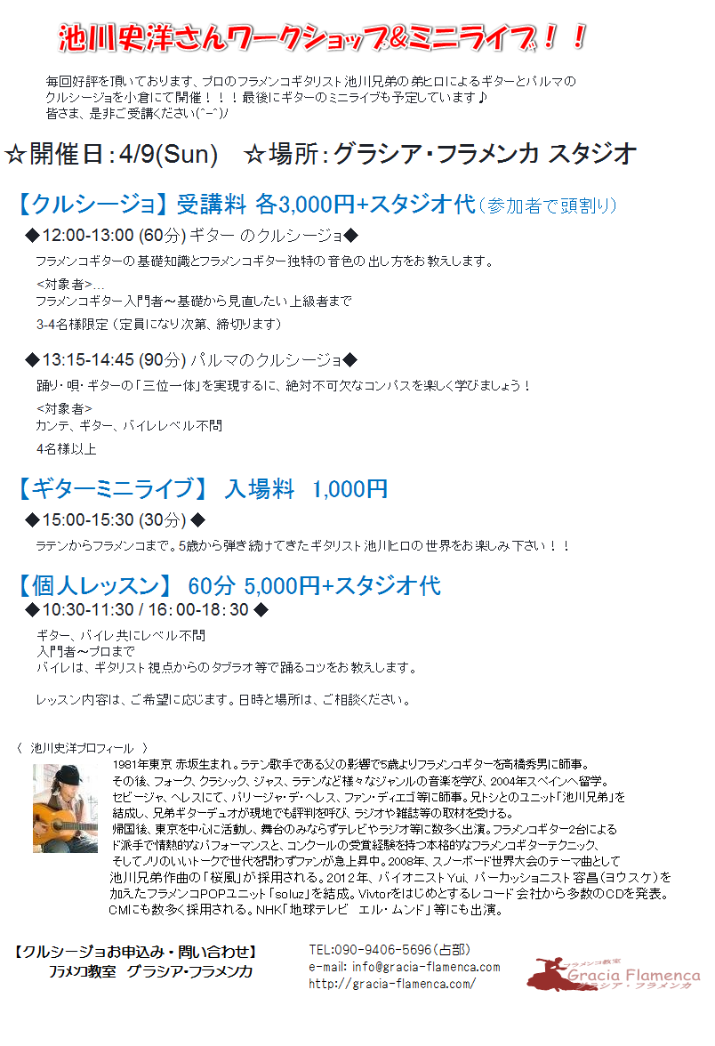 ◎4月9日(日) 池川史洋さんクルシージョ「フラメンコ講座」